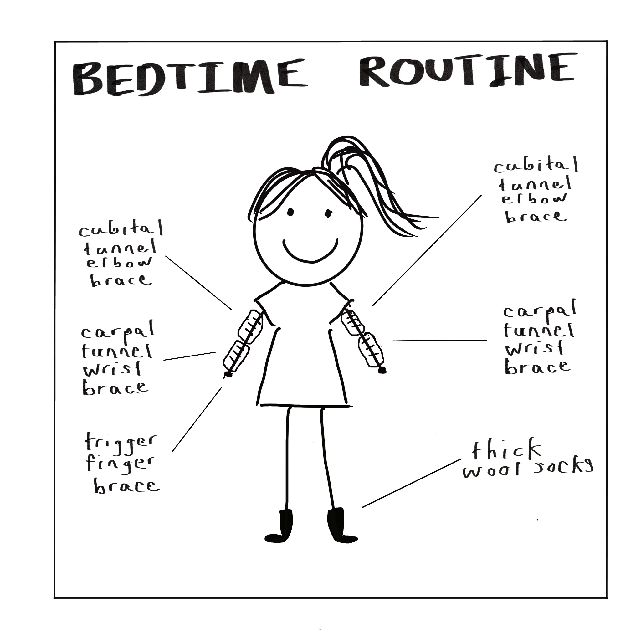 I’m becoming an old lady! Broken wrist, nerve damage, carpal tunnel, cubital tunnel, trigger finger, poor circulation. Bedtime is an actual ridiculous joke now.